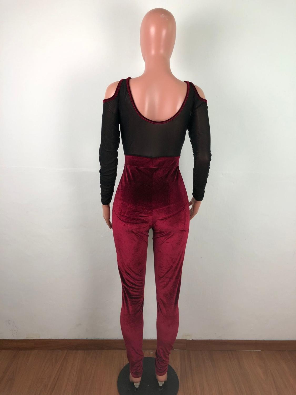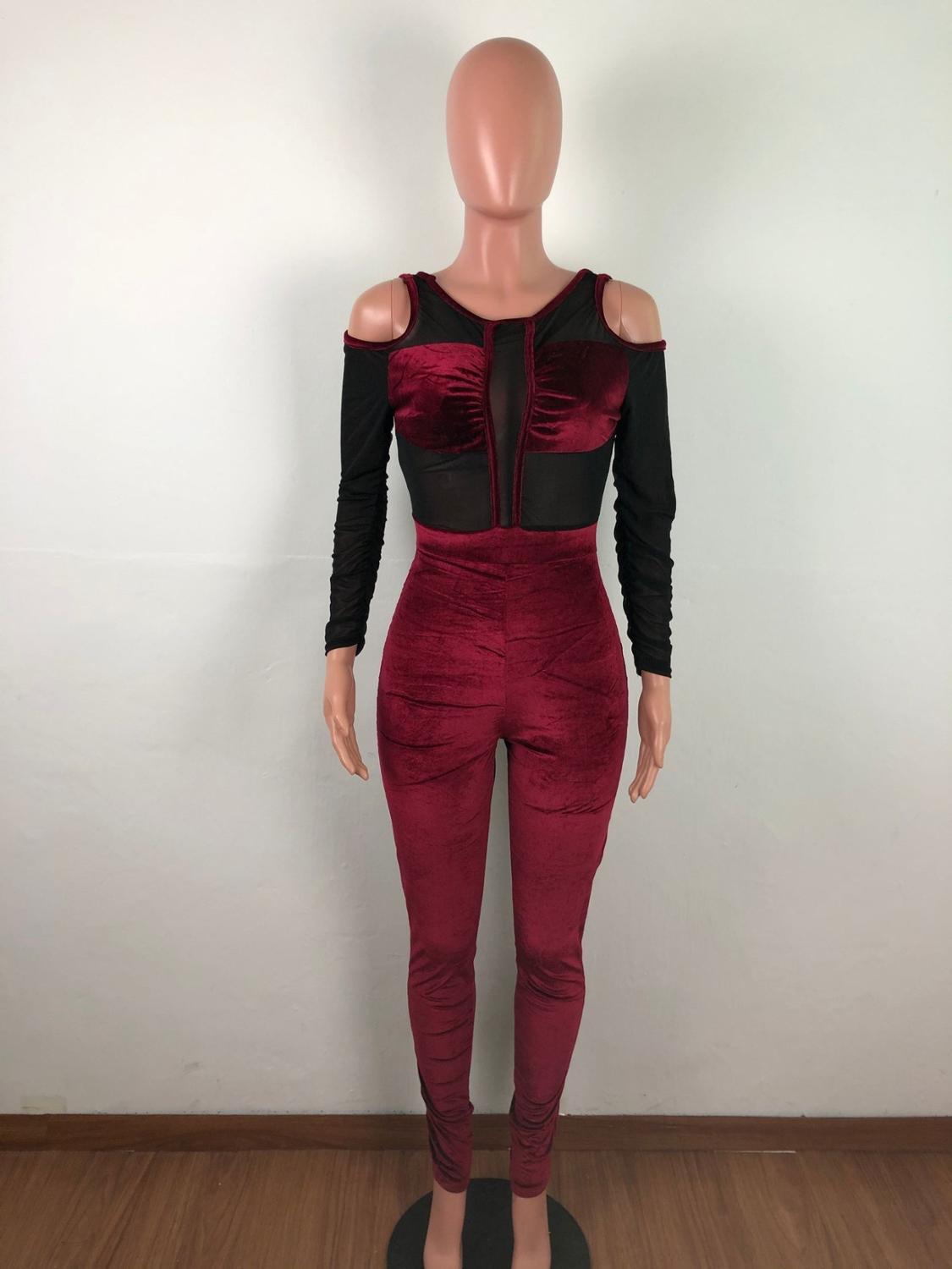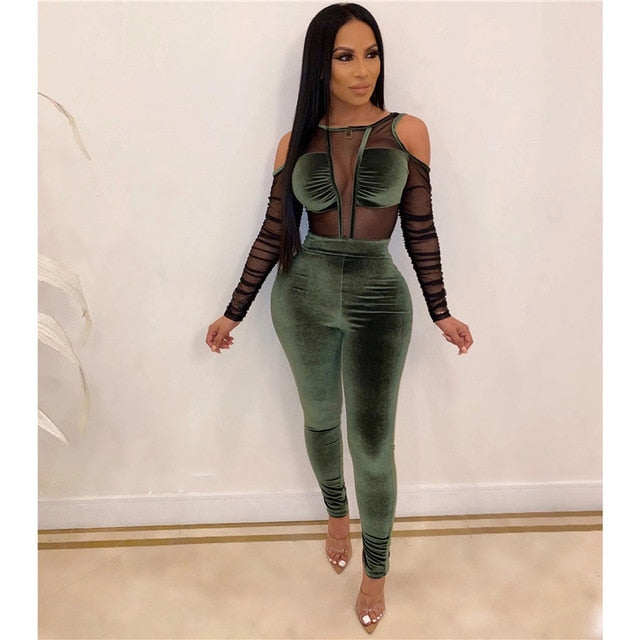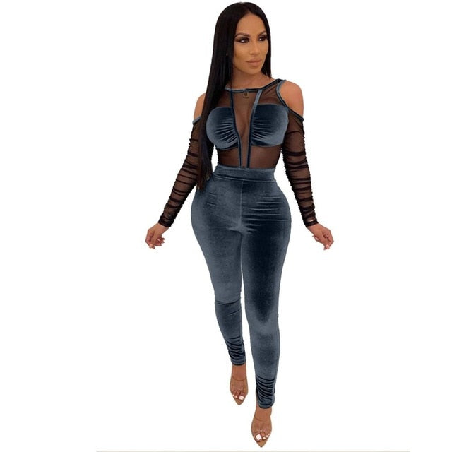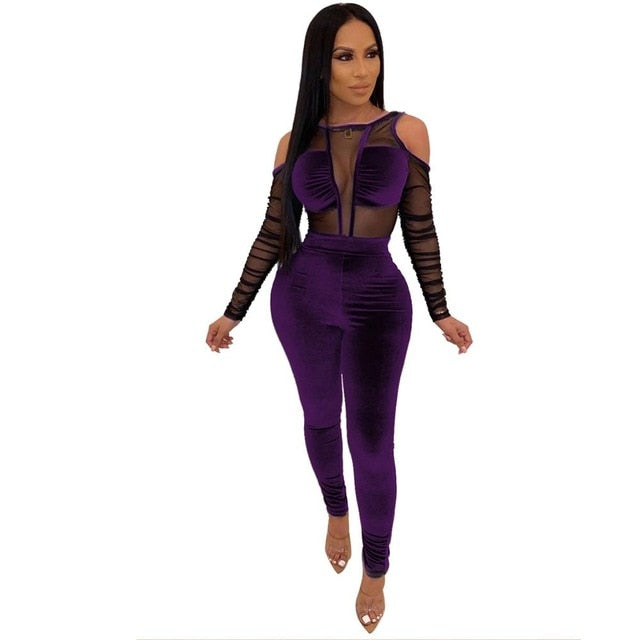 Ado girl Sheer Mesh Patchwork Velvet Jumpsuit