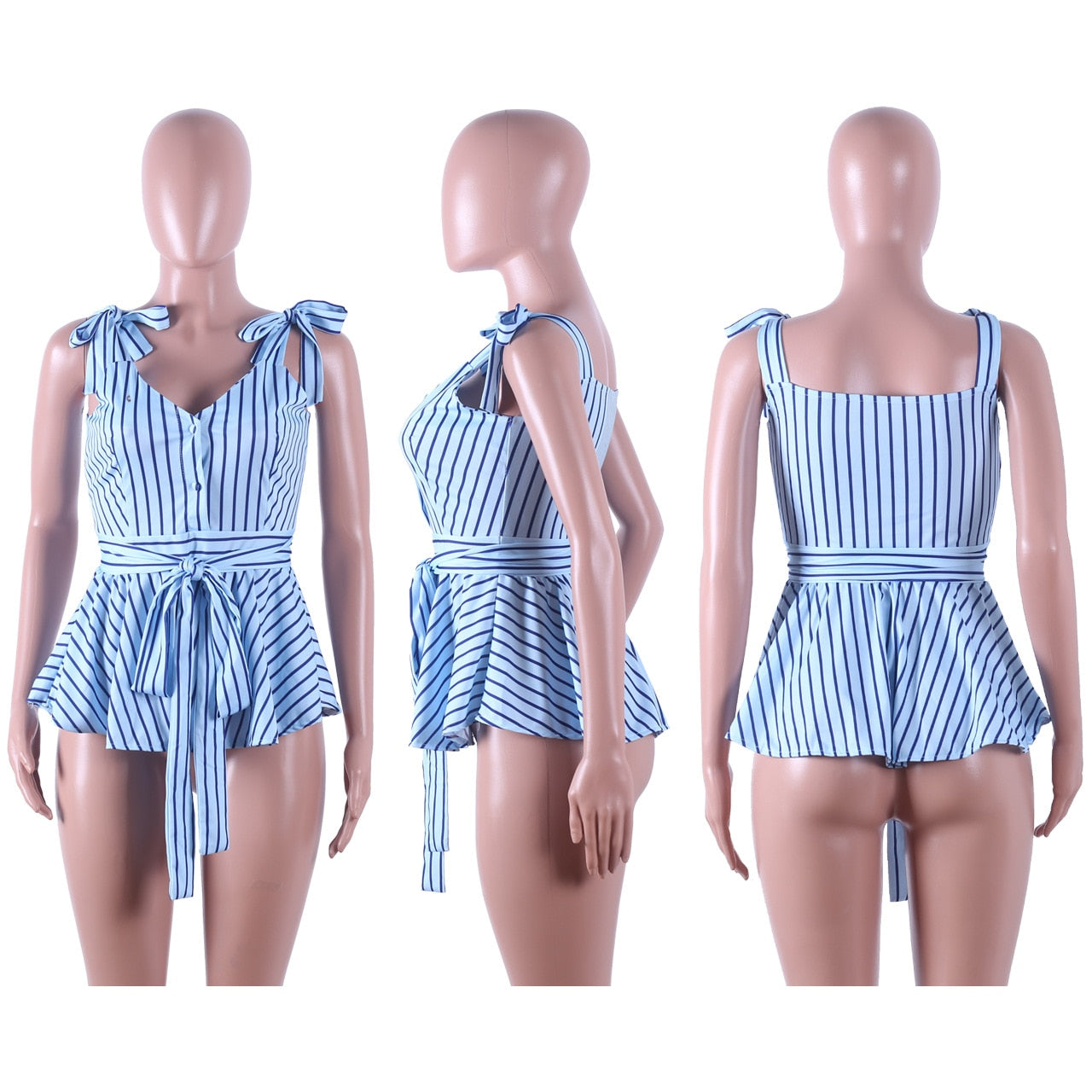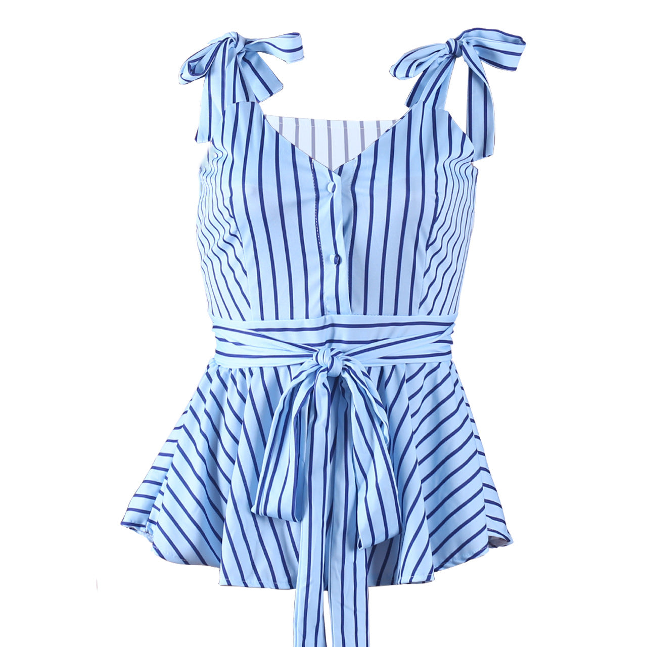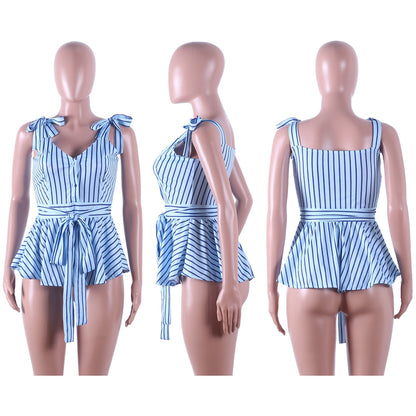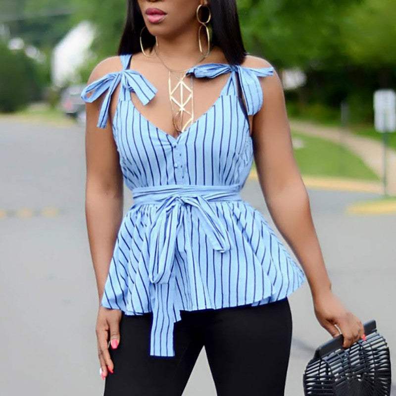 ✨ Upgrade your style with the Mbluxy Blue Striped V-Neck Lace Blouse – order now! ✨