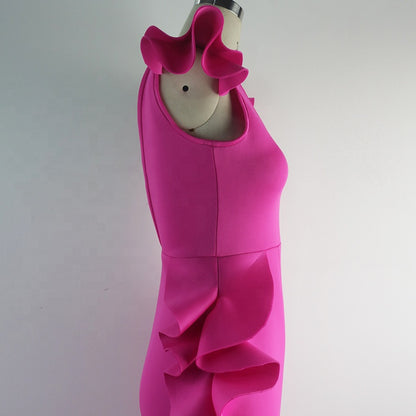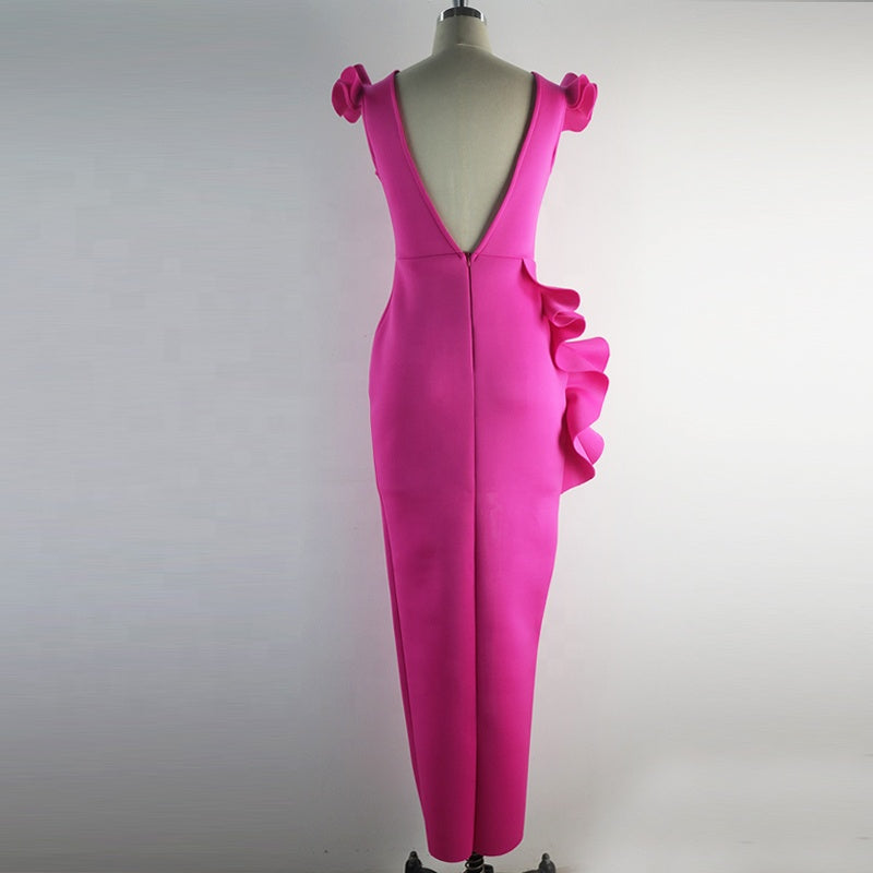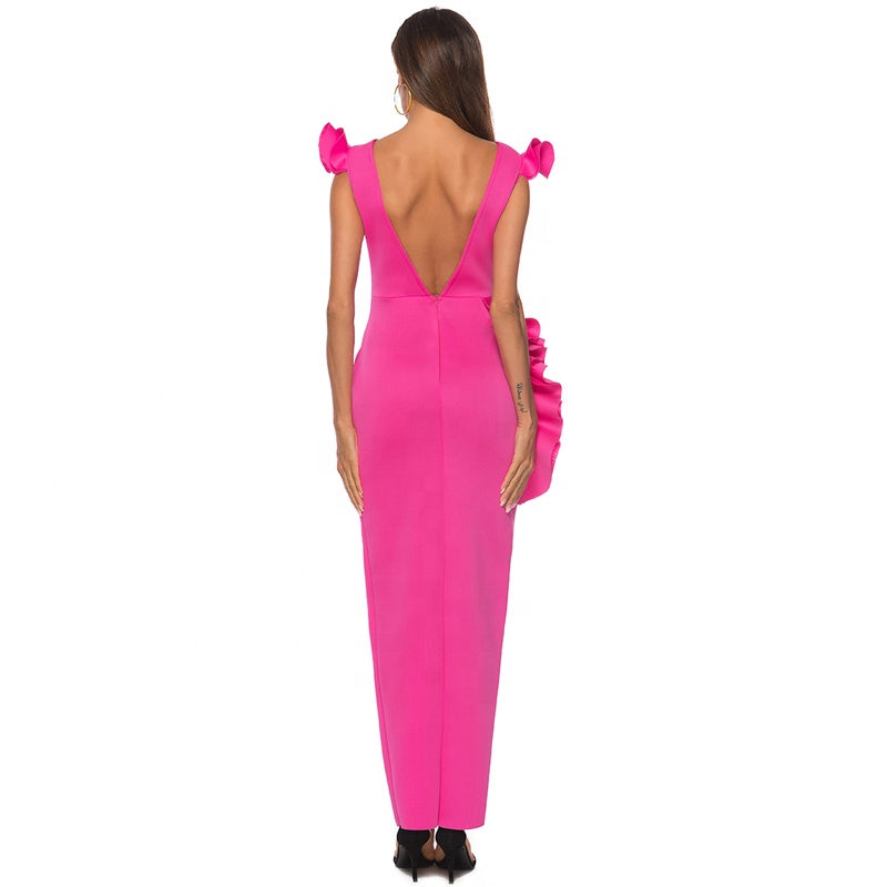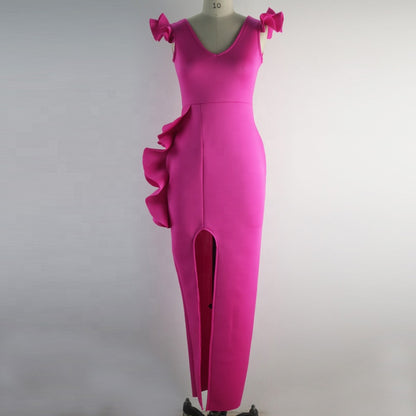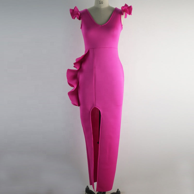 MBluxy Ruffle High Split V Neck Tight Elegant Women Evening Dress